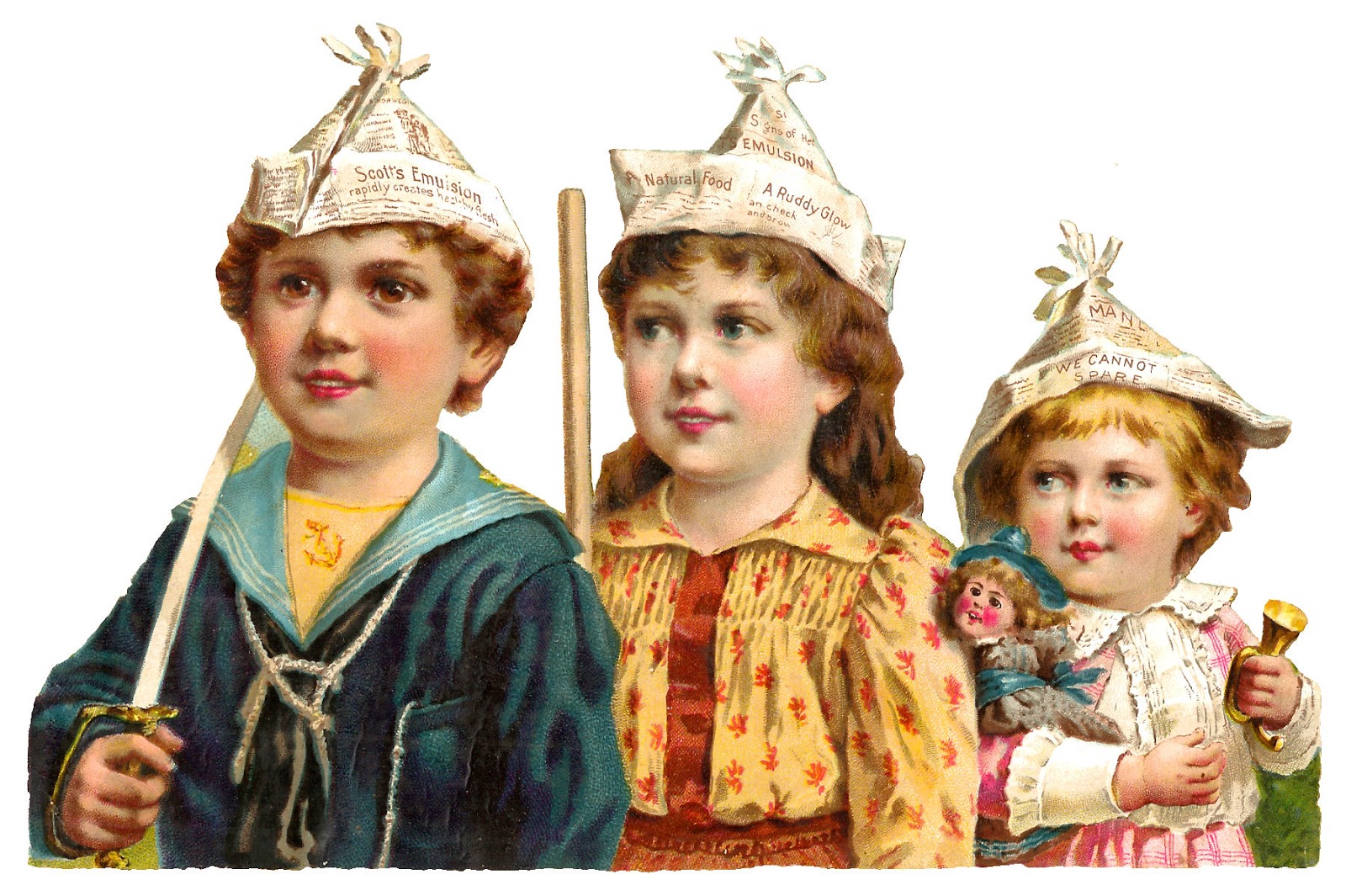 Today I've posted wonderfully charming digital Victorian children clip art of girls and boys playing. The first digital children illustration is of a boy and two girls wearing hats made of newspapers, and they're each carrying something: a sword, a wooden pole, and a small horn. They seem to be playing a military game, pretending as if they're going off to war. The second digital children download is also of a boy and two girls sitting on a bench. They're dressed in adorable clothes. One little girl is holding an Oriental fan. These Victorian children images will be great in a collage project.