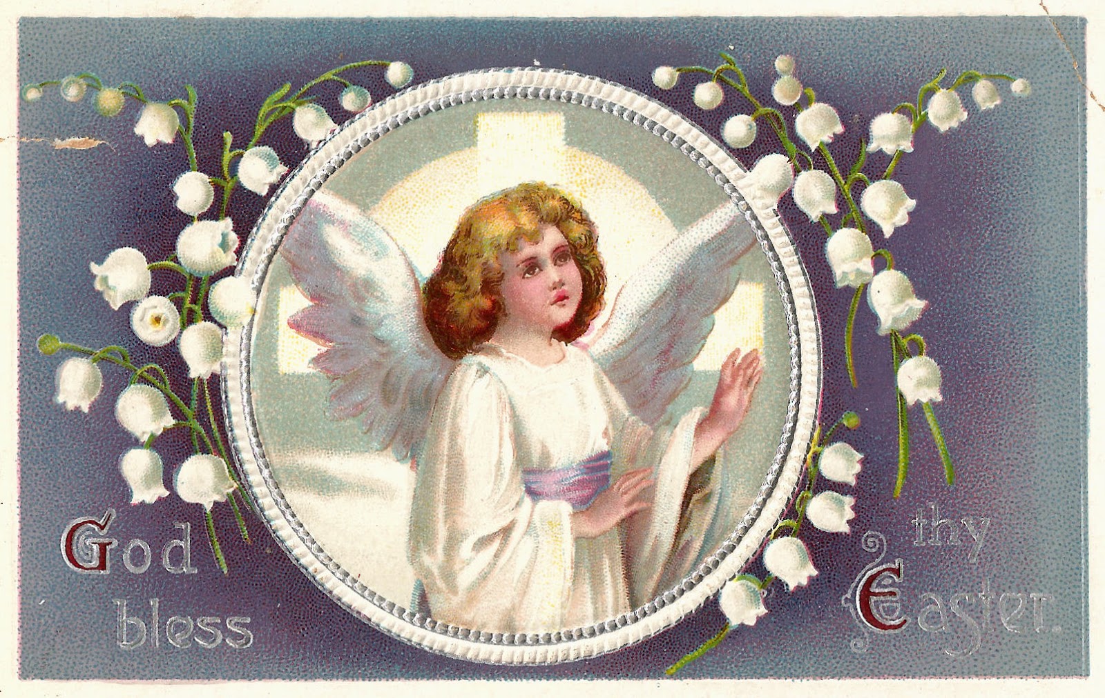 Free Easter Clip Art: Vintage Easter Postcard Greeting with Angel and White Lily of the Valley Flowers