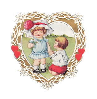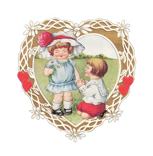 This is such a sweet vintage Valentine. This is a vintage Valentine's Day greeting card with an adorable, little couple and daisies. The gold heart design around the couple is beautiful, and I wish I could have cropped it out, but there too many other wonderful elements against allowing that. But, it's still a lovely image. I've given you both the .jpg and .png files. I hope you enjoy!