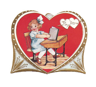 Free Printable Valentine: Vintage Valentine's Day Greeting with Red Heart and Girl at School Desk
