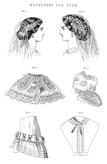 These are spectacular Victorian dresses in this piece of antique clip art! This is an 1859 Godey's Fashion Plate illustration of four very lovely dresses. All these ladies look as if they're dressed for going out walking, especially since their dresses are particularly lovely and they're wearing pretty fischus on their heads. Why red flowers and an umbrella are strewn on the ground, I don't know why, but I can imagine that the woman in the brown dress had received them from a suitor; however, he sent them to her as an apology for some unintended social faux pas, and she has seen fit not to forgive him, thus definitively throwing them on the ground, along with her umbrella, in her defiance. Her calm and collected friends look pleased with her decision. Well, I can imagine that's what happened. Why else would such beautiful flowers be in a heap on the ground? Oh, my imagination! Haha! I hope you enjoy!